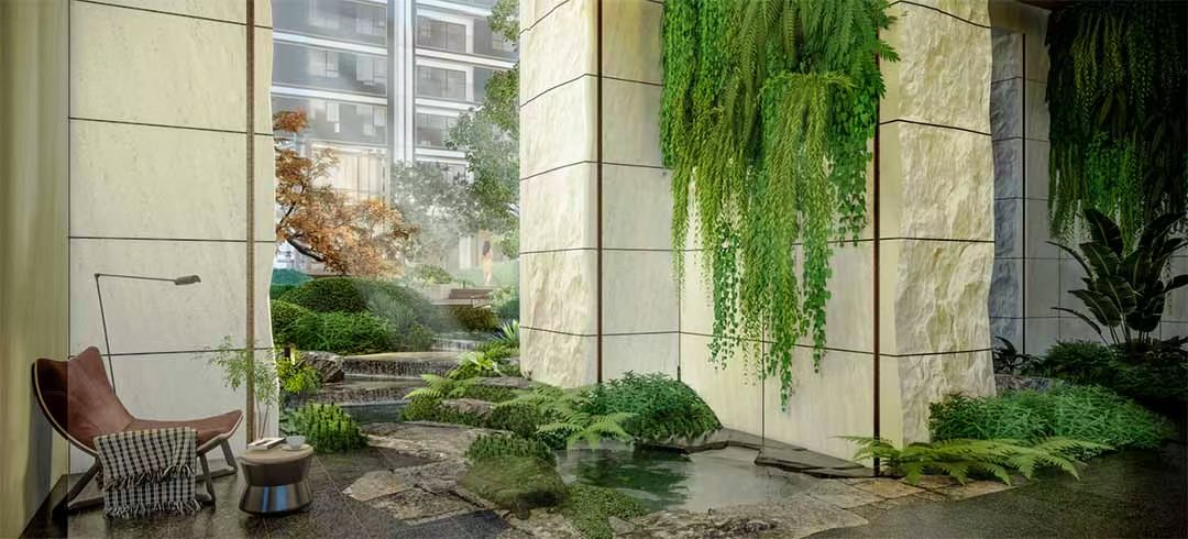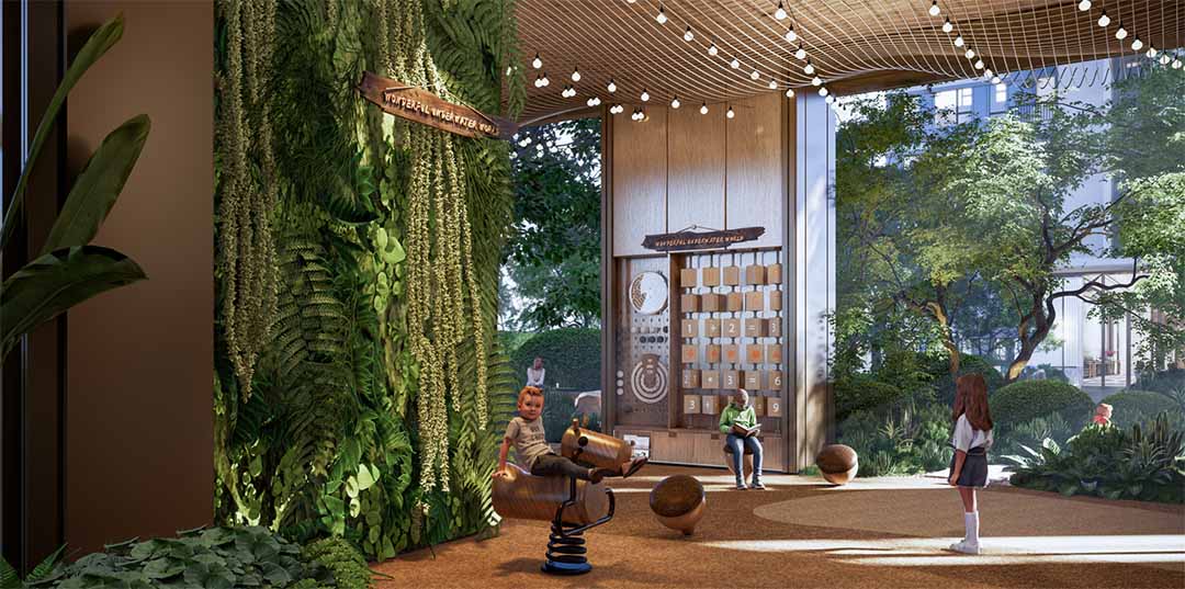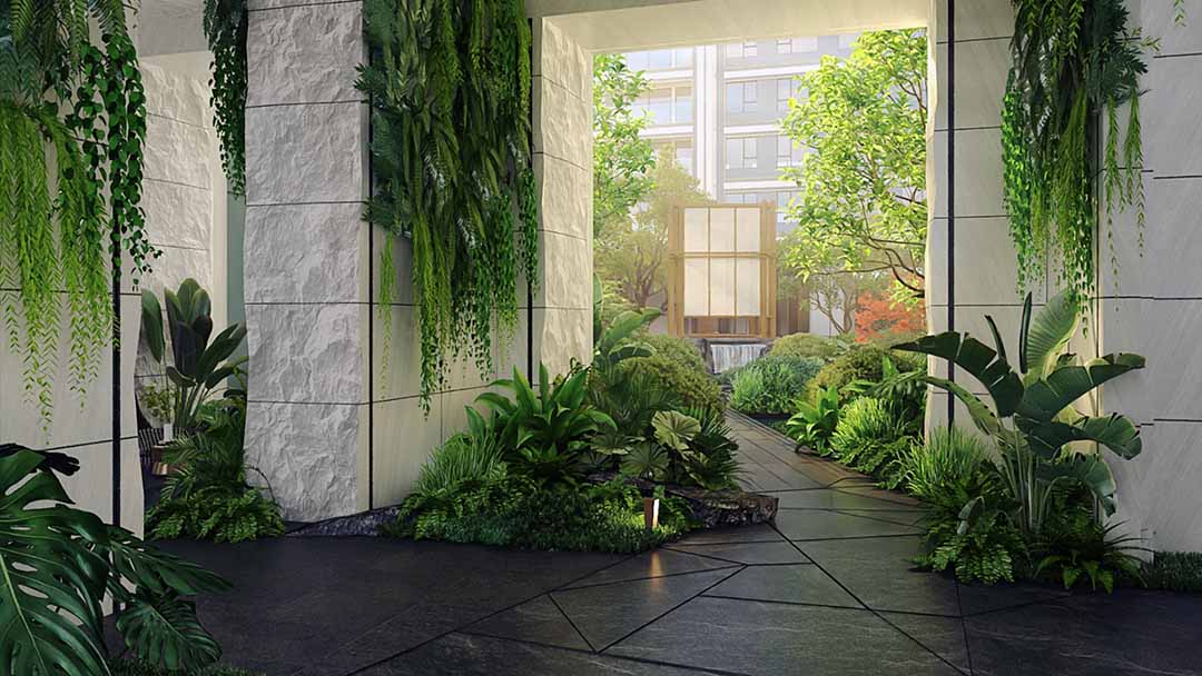 摒弃浮夸造景,以生态自然为基底,融入互动参与式设计,结合街角绿化“贝之花”与单元门屋顶景观,共同构成立体景观界面,打造沉浸式家居景观体验,让奉贤新城的公园理想,融入社区的日常风景当中。