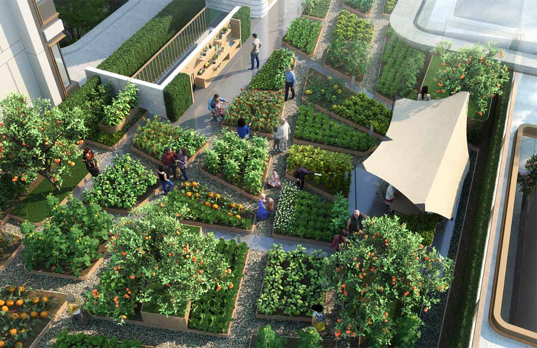 设置屋顶菜园,每户均有机会种植蔬菜瓜果,“拥有一块菜地”是深植于许多中国人心灵深处的需求,不只是为业主留住拥抱自然、触摸泥土的纯粹快乐,更在于让他们在躬身劳作时,依然能衣衫洁净、从容优雅。