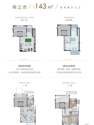 超越市场同类产品的层高,阔绰地下室空间、人文庭院空间、诗意星空露台... ...每一层都是一场突破传统墅居空间的标准重塑。通过近乎苛刻的精细化设计,将公摊面积大幅压缩,以获得更多户内空间,从而为客户解锁更多隐藏的生活彩蛋。